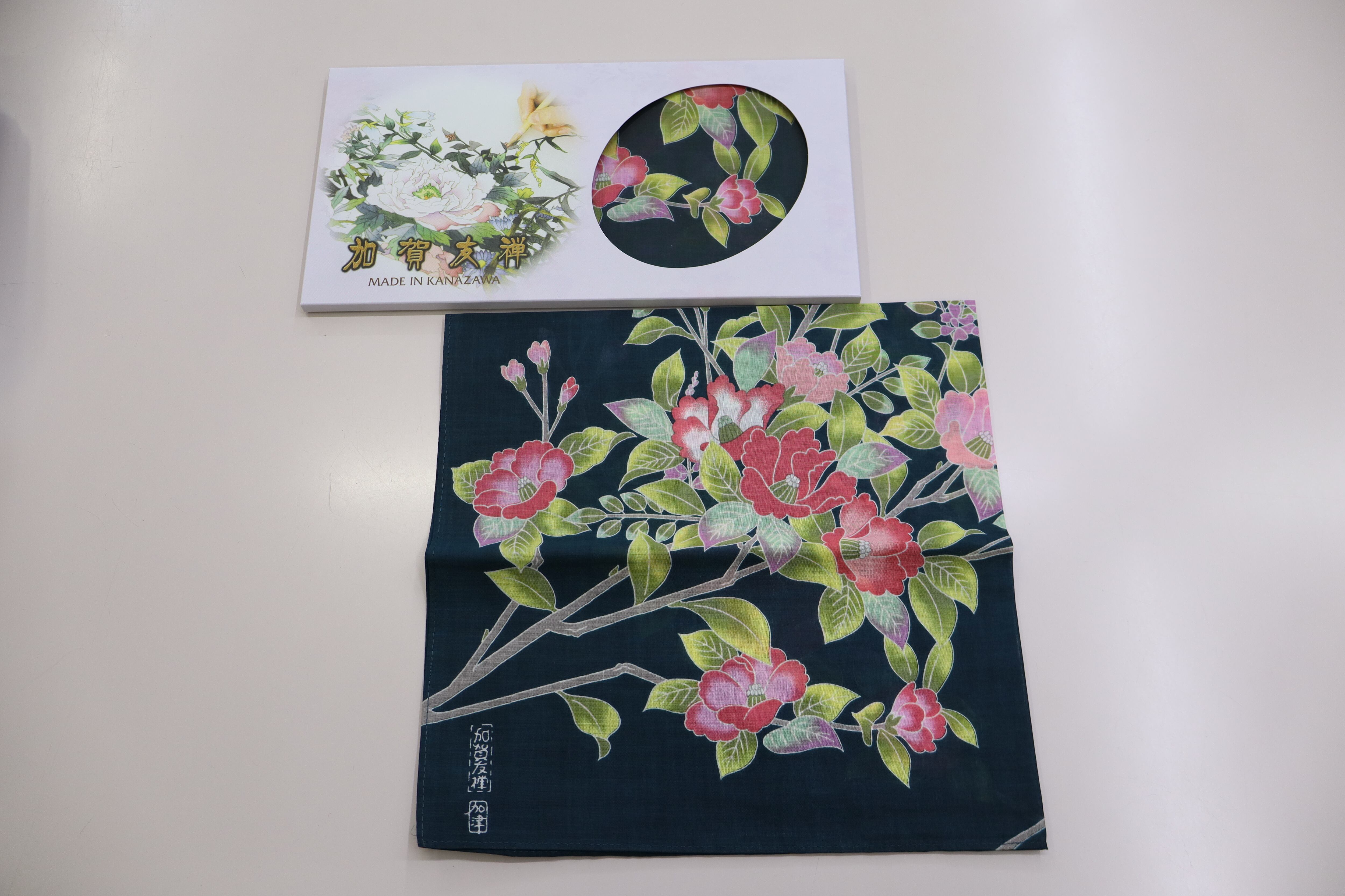 加賀友禅の型染で作られたハンカチです。専用ケース入りでお送りします。