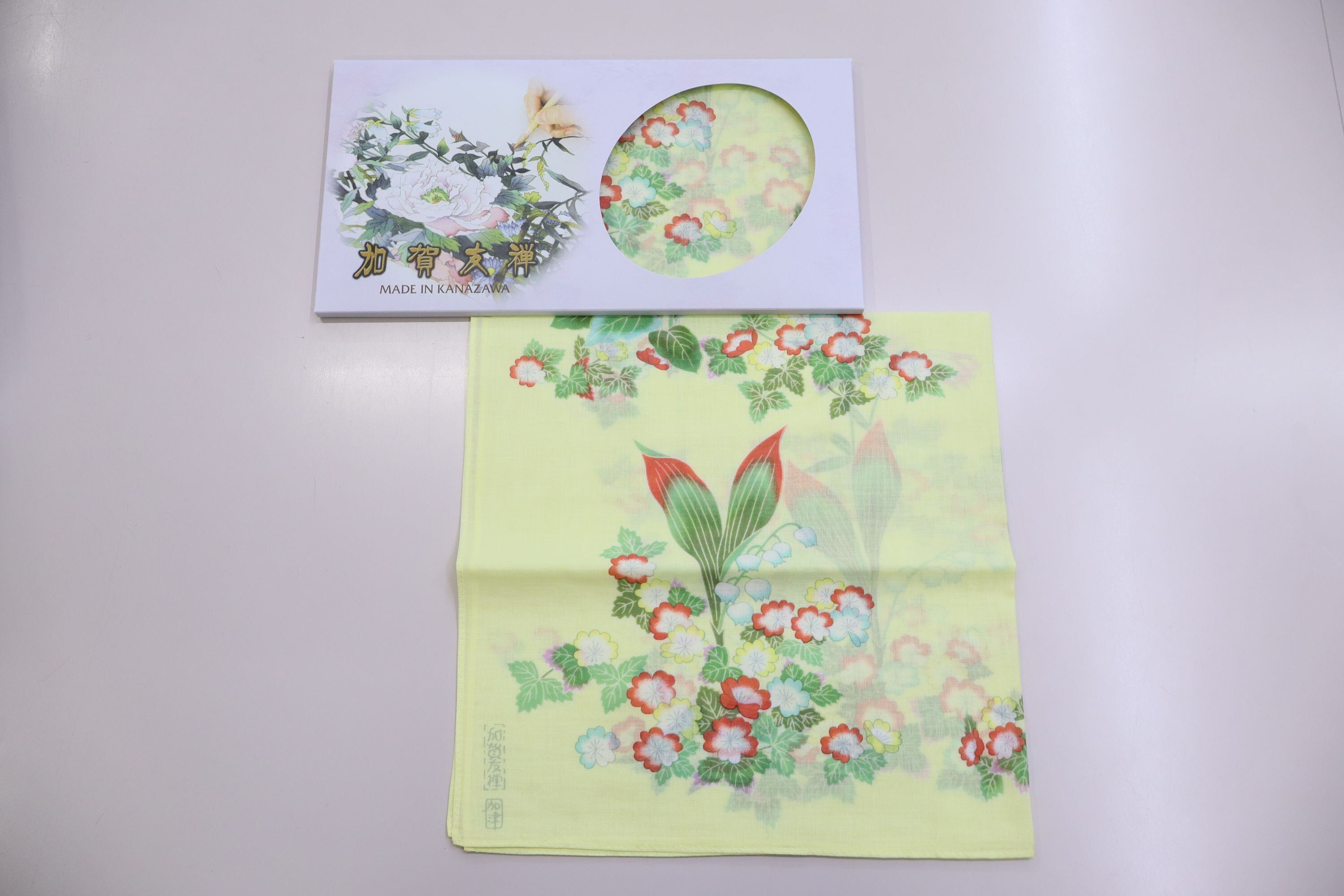 加賀友禅の型染で綿生地に染られたハンカチです。専用ケース入りでお送りします。